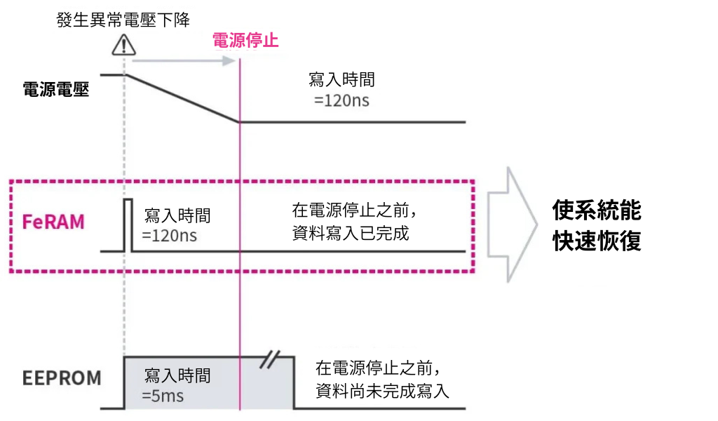 FeRAM具備極快的寫入速度,即使在系統電壓驟降等突發異常狀況下,也能在完全失去電力之前保存資料,有助於系統的快速恢復。