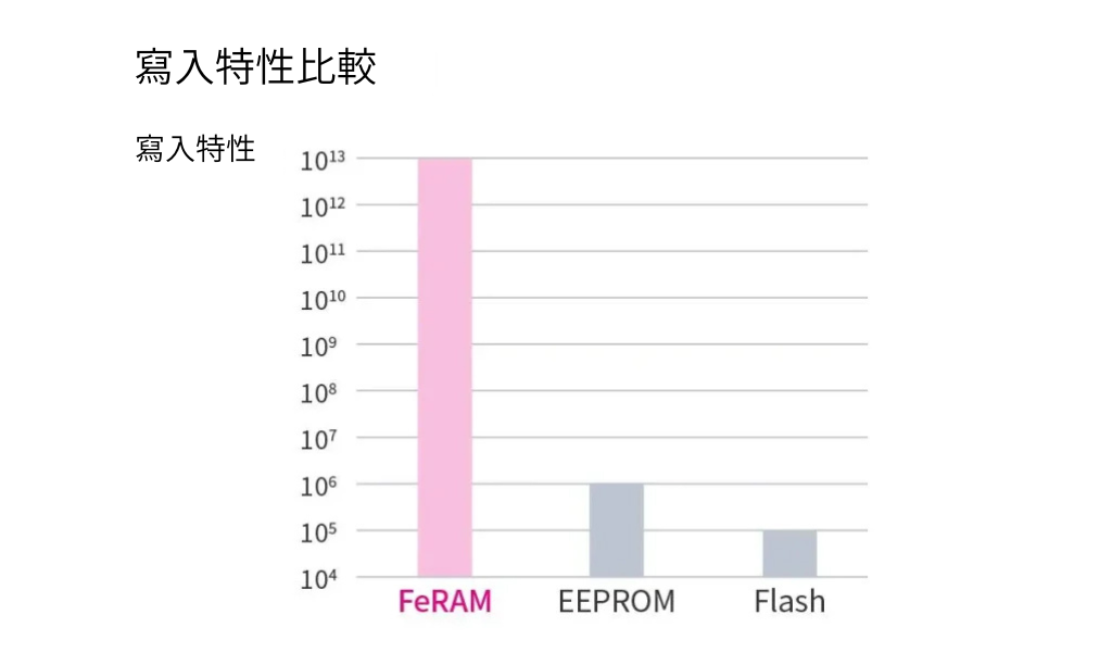FeRAM具備極高的重寫次數,最多可達100兆次(10¹⁴次)寫入。