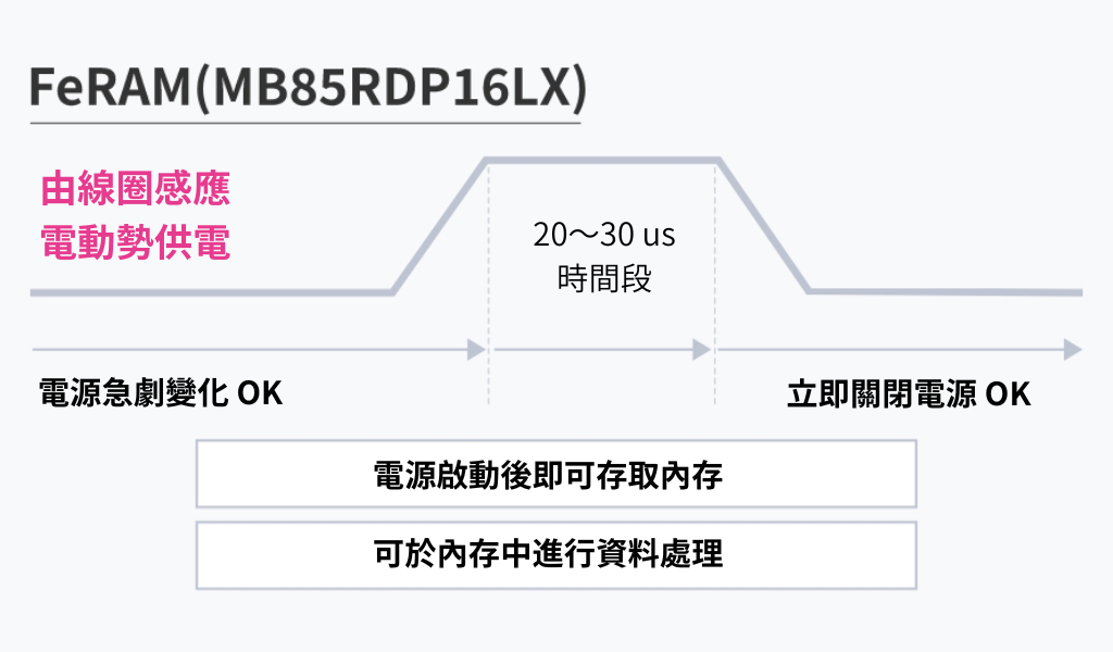 本FeRAM產品(MB85RDP16LX)即使僅提供20~30微秒脈衝式電源, 仍能正確讀取先前資料,完成計數運算後更新並保存資料, 隨時可安全關機,不造成資料遺失。