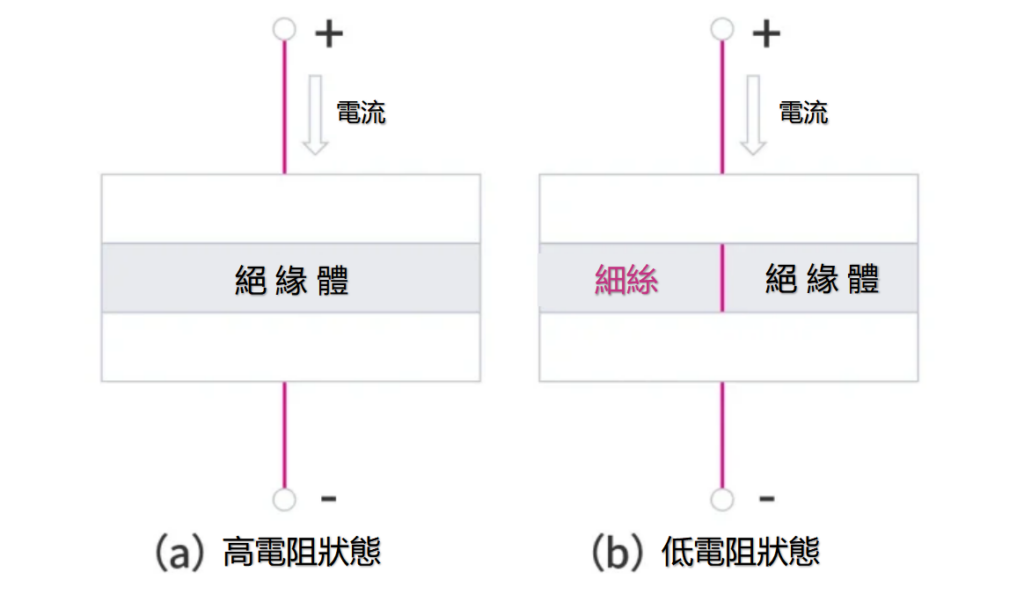 在兩個電極之間施加電壓時,處於高電阻狀態(HR)的絕緣體在特定電壓下會形成稱為「細絲(Filament)」的電流路徑,進而轉變為低電阻狀態(LR)。