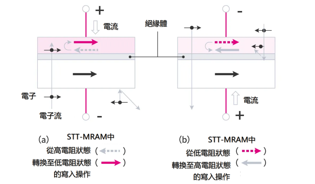 從下方注入電子時(左圖),只有自旋方向與磁體相同的電子能穿透絕緣體,並使對側磁體的磁化方向翻轉至與自旋相同的方向(自旋轉移力矩)。