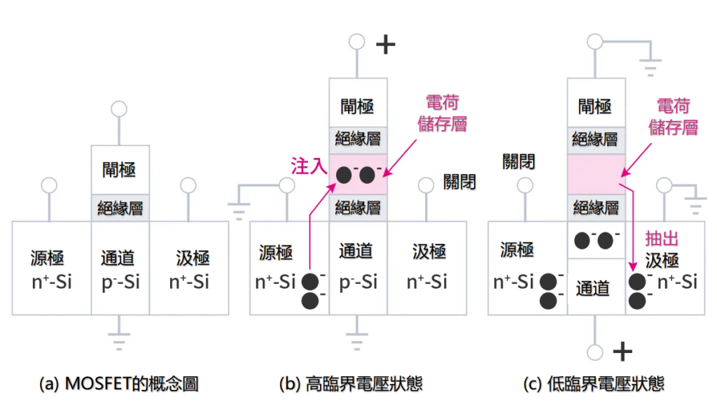 圖4 MOSFET、快閃記憶體、EEPROM的概念圖